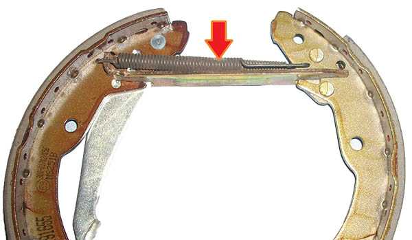 В том и в другом случае между рычагом ручного привода колодок и ребром передней колодки установлена распорная планка регулируемой длины. Она включает собственно планку, упор колодки и регулировочную гайку с пружинным фиксатором. При перемещении гайки по резьбе планки перемещается и упор колодки, изменяя длину планки. При торможении стояночным тормозом рычаг поворачивается относительно задней колодки и через планку воздействует на переднюю колодку.
