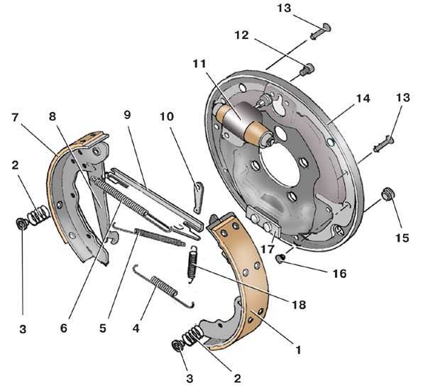 1 – колесный цилиндр; 2 – распорная (разжимная) планка; 3 – задняя тормозная колодка; 4 – рычаг ручного привода колодок; 5 – стойка колодки; 6 – пластинчатая пружина; 7 – трос привода стояночного тормоза; 8 – нижняя стяжная пружина; 9 – передняя тормозная колодка; 10 – регулировочная гайка;11 – верхняя стяжная пружина.