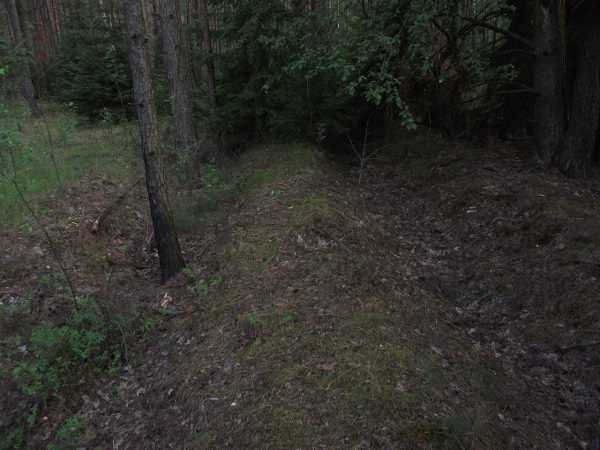 Здесь, прямо у железной дороги, просека не сохранилась, — вал идёт по лесу: