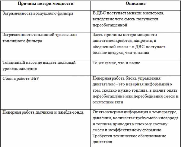 Итак, попытаемся разобраться, почему двигатель теряет мощность, при помощи следующей таблицы.