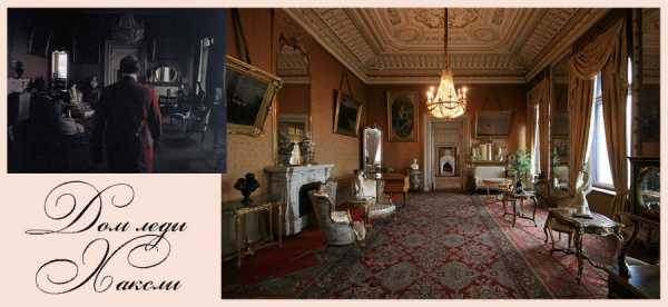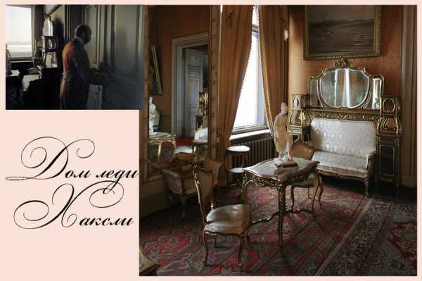…и попадают в Грушевую гостиную, где их ждёт леди Хаксли. По мере движения камеры, за окном видна Нева, затянутая льдом, стрелка Васильевского острова с ростральной колонной, Биржевой мост и Мытнинская набережная. Кстати, Нева в этом месте в 2–3 раза шире любой Темзы. Гарнитур стоит на том же месте (как и вся прочая мебель во дворце), только обивку сменил на более благородную.