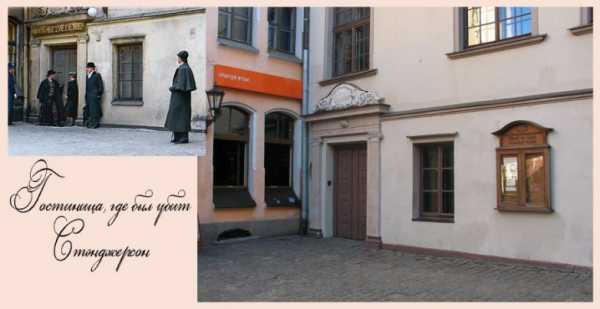 В Риге режиссер нашел и подходящее для съемок здание гостиницы. Им стало Иоаново подворье, или Яня сета. В одном из кадров мы видим, как экипаж проезжает через старинные ворота. В Риге они расположены между зданием Конвент Экка (ул. Скарню, д. 20/22) и церковью, названной в честь Св. Иоанна.