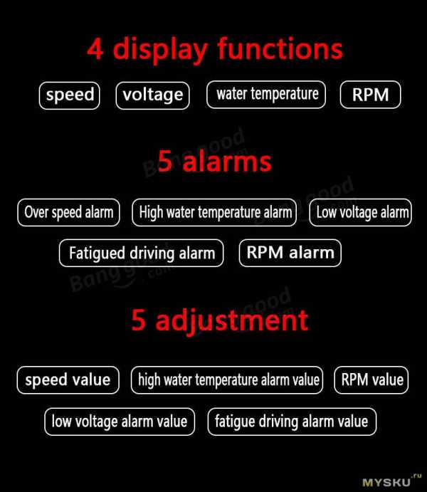 5. Звуковая сигнализация низкого напряжения, высокой температуры охлаждающей жидкости, превышении скорости, превышение количества оборотов двигателя, усталости водителя; 6. Автоматическая и ручная регулировка яркости отображения информации; 7. Возможность ручной установки порогов сигнализаций. 8. Задержка выключения проектора после выключения зажигания.