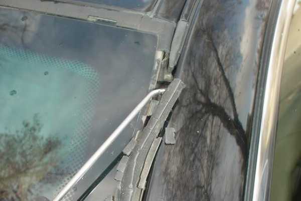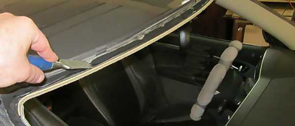 Начинать снимать старое (разбитое или треснувшее) лобовое стекло нужно с разрезания острым ножом засохшего герметика.