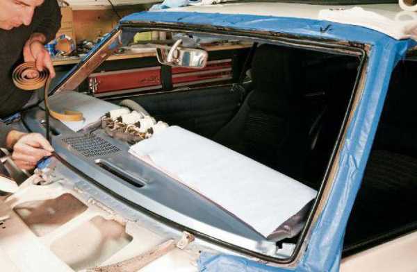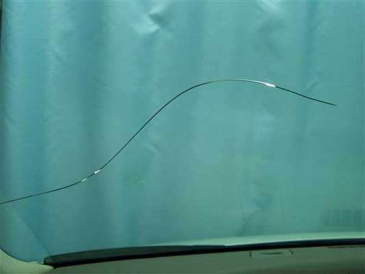Так будет подготовлено место для установки. Далее производится обезжиривание поверхности. А затем вклейка лобового стекла.Струна или нож аккуратно заправляется в щель между стеклом и установочным пазом. Далее старый клей просто перерезается. Необходимо работать внимательно, особенно там, где стекло граничит с панелью, так как можно легко повредить пластик.