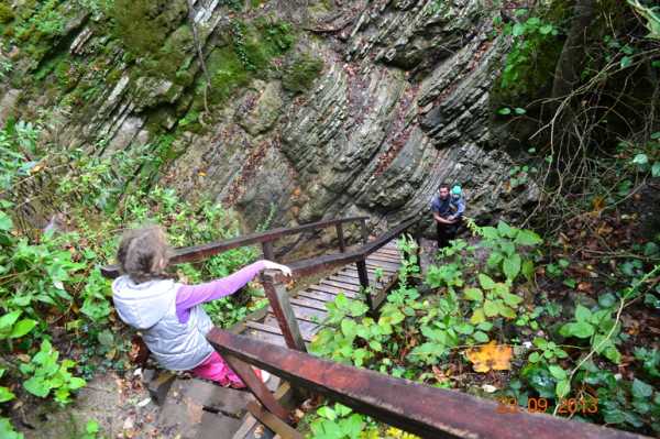 вобщем, мы полезли. Дальше дорожка прям по руслу ручья. Он высох (нам повезло) и шли мы прям по камням. Потом опять крутые лесенки и дорожки почти без перил. Кругом овраги и склоны. Прошли мы почти 5км!! дети у нас не ныли. и шли сами все эту опасную дорогу.