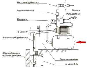 – Электрический насос, закачивающий воду из внешнего источника. В зависимости от способа реализации схемы он может быть погружным, постоянно находящимся под водой, а также внешним, поверхностным.