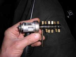 Вытащили личинку вместе с ключом, провернуть ключ в замке, вынуть сердцевину с секретами. Заметили, что вставив ключ не все пины в корпусе сердцевины «спрятались», скажем так правильно «заподлицо» они должны быть. Вынимаем пины, записывая себе, где какой находится, пружинки складываем отдельно. Потом пружинки пальцами слегка растягиваем, чтобы придать первоначальный вид и восстановить форму.