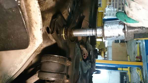 Открутив эти 6 болтов подрамник опускается с одной стороны. Чтобы он не упал, да и для того чтобы откручивать последний болт без затруднений, подрамник поддерживается домкратом.