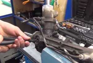 Кстати, именно так и происходит диагностика рейки: пока один специалист медленно вращает рулевое колесо установленного на подъемник автомобиля, второй следит за равномерностью поворота колес и прислушивается к звукам, доносящимся из-под капота. Просто износ деталей рейки проявит себя в неравномерности или разном угле поворота колес, поломка зубчатой передачи – треском и скрежетом. Таким образом можно определить только характер поломки, окончательно же выявить вышедшую из строя деталь мастер сможет только после демонтажа и полной разборки всего механизма. Только после этого будет произведен ремонт рулевой рейки.