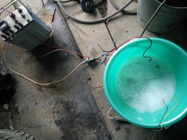 Подключаем все это дело к зарядному устройству на максимальный ток и происходит реакция. Ионы от делали отделяются и при помощи раствора перемещаются на пластину, при этой реакции выделяется едкие вещества, поэтому делать ТОЛЬКО в хорошо проветриваемом помещении!