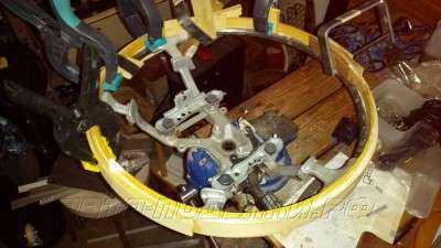 03. Руль, с голым в местах вставок под дерево каркасом обода, вставляю в матрицу (технология изготовления матрицы анатомии руля), чтобы уточнить края стыка на руль кожа дерево. В матрице, на плоскости фланцев, удобнее разметить симметричные линии реза. По меткам в матрице я подрезаю край вставки под дерево с кожей на руле.