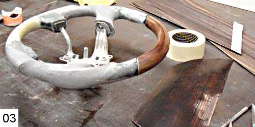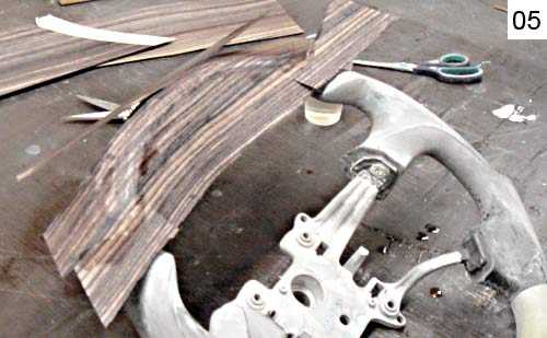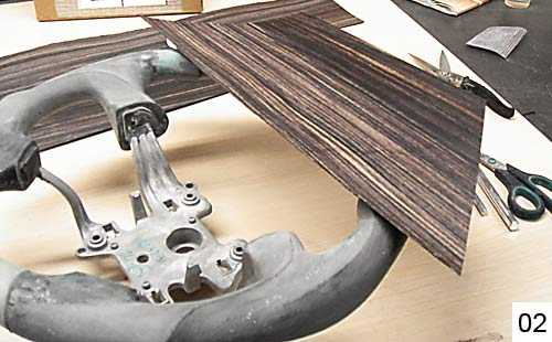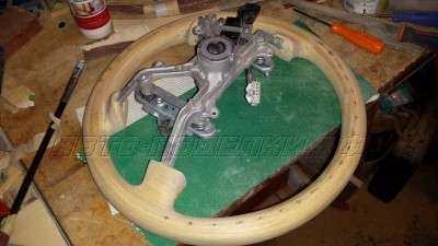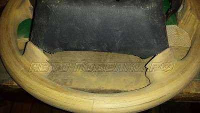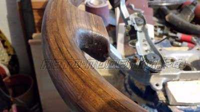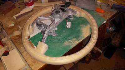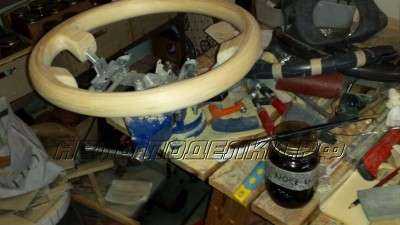 Но теперь мне приходится перед обтяжкой кожей красить руль со вставками под дерево черной краской, чтобы заказчик не пугался.) А на краску эту клей не приклеивается и после показа деревянного руля хозяину нужно ее смыть.