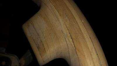 07. В первой части про деревянный руль один читатель просил уточнить: «как заканчивается край кожи на стыке со шпоном». Оформляется стык на руль кожа дерево через щель, пропиленную в ободе. В щель эту должен входить край кожи, плотно прилегая к торцу вставки под дерево. Руль протачивается при помощи надфиля или, как я люблю это делать, линейкой с наждачной бумагой. При этом, не сошкуривается торец со стороны линейки, и наждачка не изгибается. Такая подготовка зазоров стыка на руле кожа дерево поможет аккуратному и ответственному шпонщику – он не испортит работу макетчика.