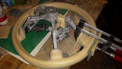 Изготовление вставок под дерево на руле требует прочной основы, так как после наклеивания, во время сушки, шпон сильно стягивается и стремиться деформировать деталь (усилие колоссальное). Про изготовление вставок под дерево из стекловолокна, я расскажу позже, в другой статье.