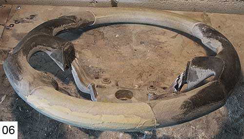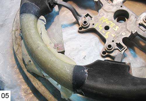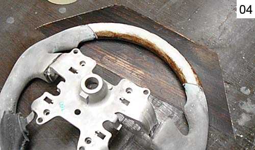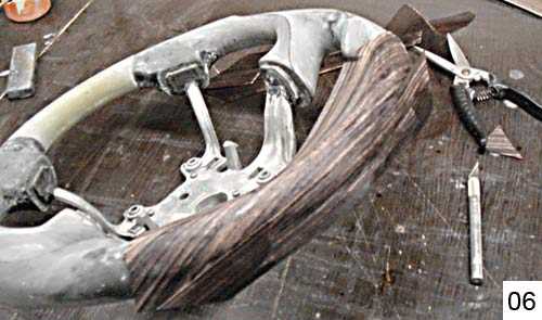 04. Как делать корочку из стекловолокна, я показывал на разных примерах тюнинга. Как сделать «монолитный» кусок стеклопластика, той же болванки анатомического руля мы тоже пробовали (фото 06 — 07), поэтому склею вставки под дерево на руль тем же способом. Но в отличии от анатомии, где я частично оставлял резину под стеклопластиком, болванка вставки под дерево формуется прямо на металлический каркас руля. Еще на первом моем руле с деревом шпонщик строго предупредил: никакой резины – только монолит… С тех пор я послушно набиваю матрицу вставки под дерево «волосатой кашей» (полиэфирная смола, аэросил, стекловолокно).
