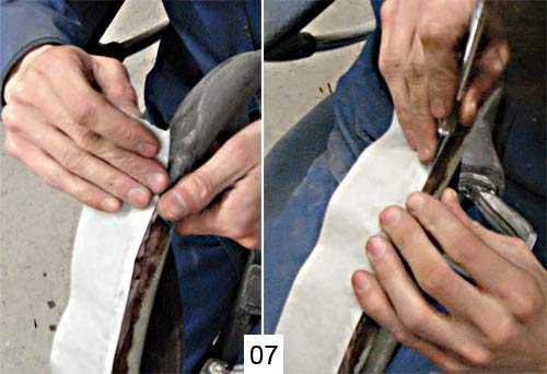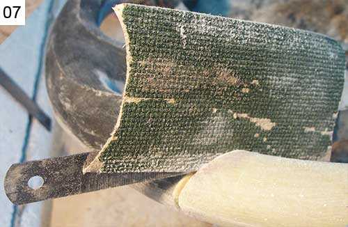 12. Перед обтяжкой кожа промазывается клеем. Теперь снова оборачиваем кожей руль дерево, желательно на то же место, что и во время кройки (для этого на коже и руле ставят метки для совмещения, фото 03).
