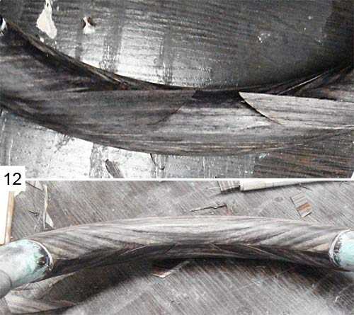 08. Наружная часть шпона легла с нахлестами, а вот волокна шпона на внутренней стороне вставки под дерево разошлись – образовались клиновидные просветы. А посередине вообще «дырка» в виде галочки.