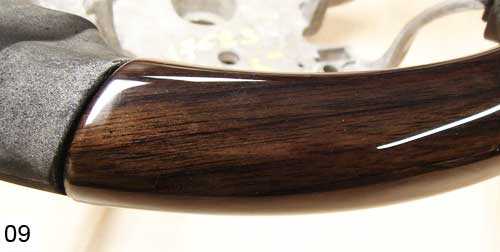 09. А вот так должен выглядеть руль дерево — торец и зазор от очень хорошего мастера! Стык кожа дерево на руль построен правильно. Опять же, кожник-обтяжчик будет доволен.