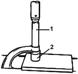 Рис. 5.30. Использование съемника 09545–4А000 (1) для выдавливания пальца шарового шарнира из гнезда опоры ступицы |