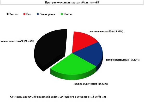 Согласно проведённому опросу сайта Автогид.ру среди 130 водителей возрастом от 18 до 65 лет по вопросу прогрева двигателя автомобиля были получены следующие данные. Всегда прогревают автомобиль зимой 38,46% водителей от всего количества опрошенных. Никогда не прогревают двигатель 15,38% водителей. Очень редко это делают 19,23% водителей и иногда прогревают мотор 26,92% автолюбителей.