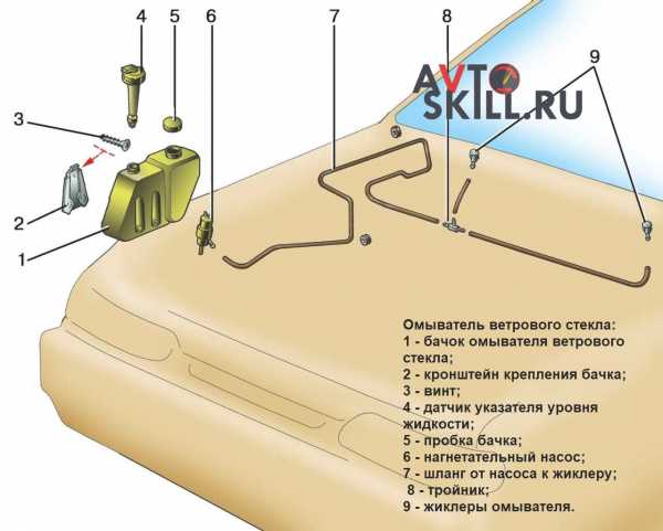 Узел очищения лобового стекла состоит из следующих основных элементов:
