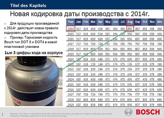 Дата производства тормозной жидкости Bosch указана на упаковке в виде 8-мизначного набора цифр, первые 3 из которых являются кодом даты производства тормозной жидкости (см. фото).