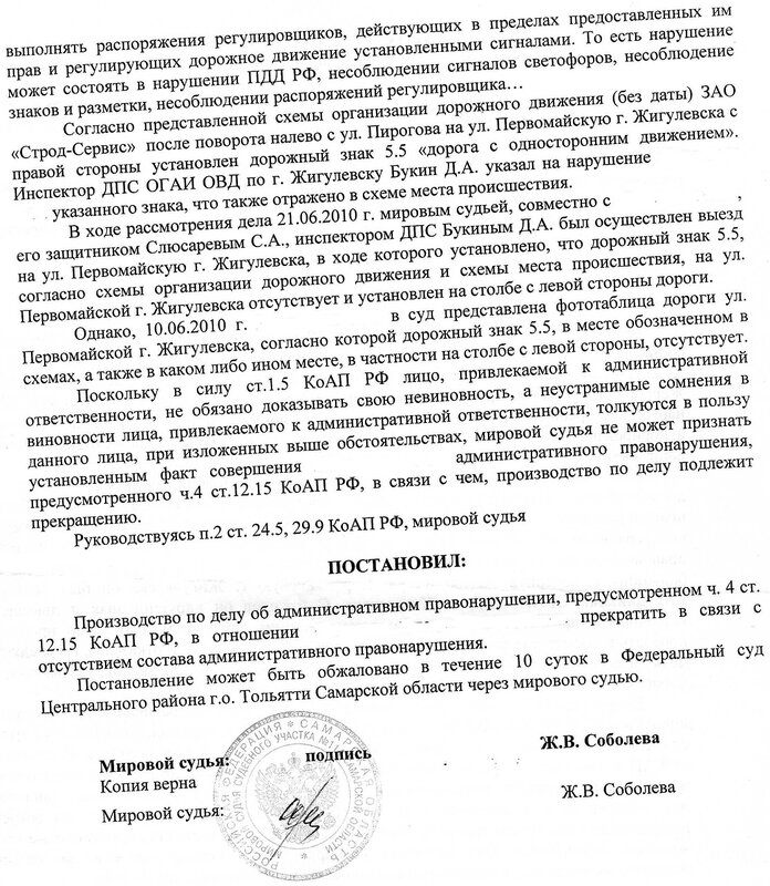 Решением судьи Колпинского районного суда Санкт-Петербурга от 17 октября 2011 года постановление мирового судьи изменено в части указания в описательно-мотивировочной части постановления, что «С., являясь водителем, выехал на полосу, предназначенную для встречного движения, в случае, если это запрещено Правилами дорожного движения, за исключением случаев, предусмотренных ч. 3 ст. 12.15 КоАП РФ, а именно: 18 июня 2011 года в 12 часов 38 минут водитель С. управлял транспортным средством <…>, государственный номерной знак <…>, двигаясь от ул. Первомайской в сторону Петрозаводского шоссе (Санкт-Петербург, Лагерное шоссе, дом 63, складское помещение) в Санкт-Петербурге, на дороге с двухсторонним движением, имеющей две полосы для движения, совершил обгон другого движущегося транспортного средства с выездом на полосу дороги, предназначенную для встречного движения при обгоне транспортного средства в зоне действия дорожной разметки 1.