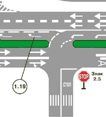 (прерывистая линия с короткими штрихами и равными им промежутками) — обозначает границы полос движения в пределах перекрестка.
