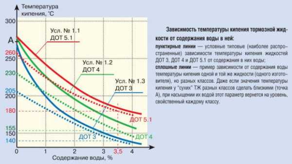 На современных автомобилях в основном применяются гликолевые тормозные жидкости, которые имеют целый ряд преимуществ. Но, к сожалению, за год гликоль заберет из воздуха до 2-3% влаги, и жидкость приходится периодически менять, причем заблаговременно, пока она стала представлять опасности для надежной работы тормозной системы. (см. рис). Периоды замены обычно указывают в инструкции по эксплуатации автомобиля, которые составляют от 1 до 3 лет.