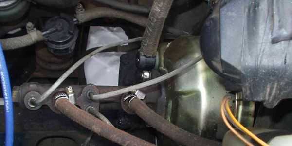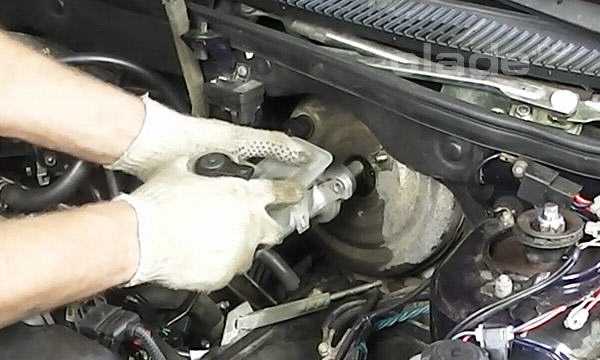 В двигательном отсеке снимаем корпус воздушного фильтра левый, кожухи, резинки и откручиваем 2 тормозных трубки. извлекаем шланг идущий от вакуумника к главному цилиндру сцепления.