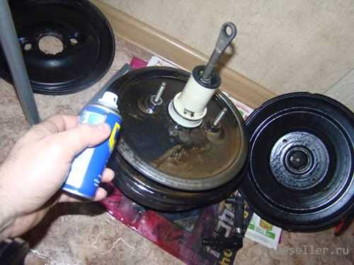 После разборки в вакуумном усилите было много грязи от попавшей воды, и отслоившейся краски, для очистки купил пенный очиститель двигателя, забрызгал вакуумник, почистил все промыл, и прошел все жидкостью WD-40.