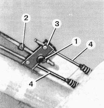 ![]() | Регулирование натяжения тросов привода стояночного тормоза: 1 — контргайка; 2 — регулировочная гайка; 3 — ypавниватель; 4 — тросы привода |