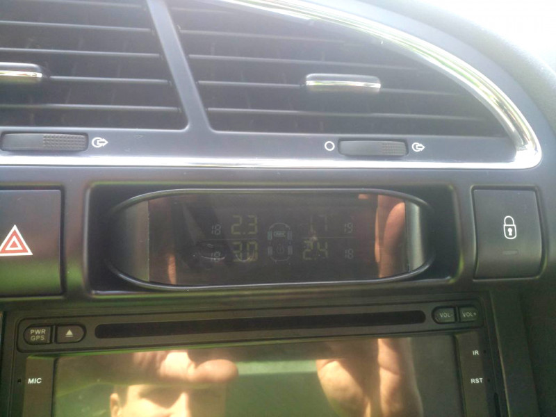 Как и ожидалось, прибор громко начал пищать и заморгал значением 1,7 Бар в правом переднем колесе. Но там 1,8 Бар, а прибор показывает 1,7 — не точность.