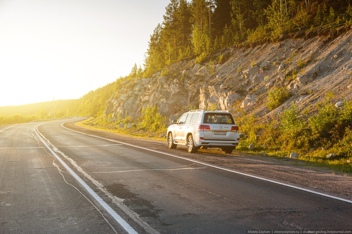 Чем дальше на север уходит дорога, тем красивее становится пейзаж вокруг: тайга с соснами и елями постепенно сменяется лесотундрой, встречается множество серпантинов, перевалов и озер ледникового происхождения. А впереди все четче и четче вырисовываются в дымке Хибинские горы.
