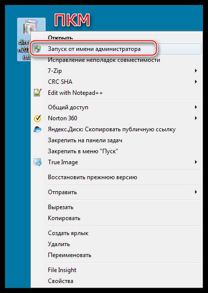 Если Вы единолично пользуетесь компьютером, то, скорее всего, у Вас есть права администратора и нужно просто сообщить ОС, что Вы разрешаете установщику совершать необходимые действия. Сделать это можно следующим способом: вызвать контекстное меню проводника, кликнув ПКМ по файлу инсталлятора DirectX, и выбрать «Запустить от имени администратора».