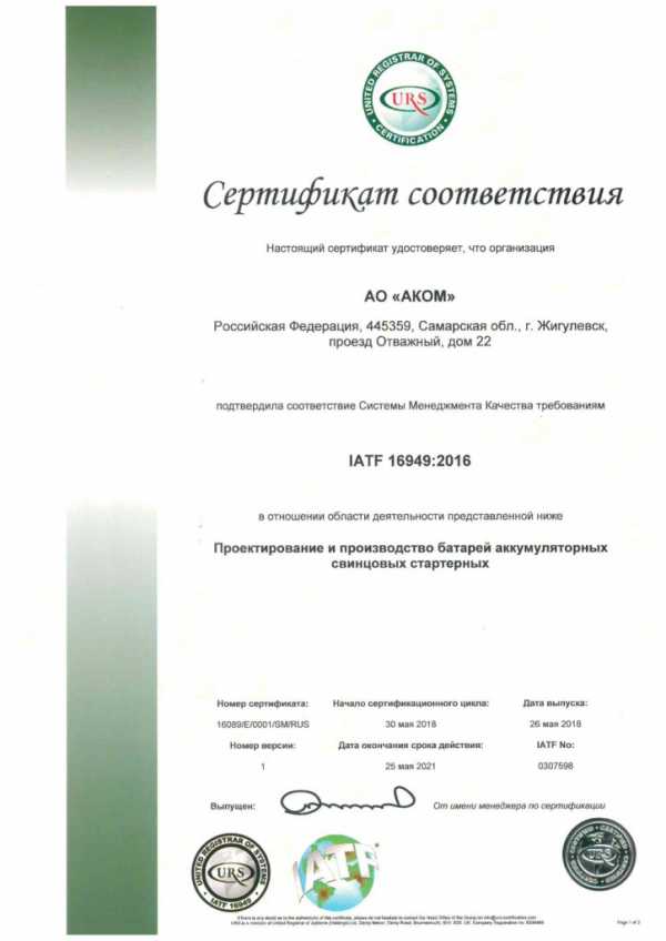 Система менеджмента качества АО «АКОМ» сертифицирована на соответствие стандартам ISO 9001:2015, IATF 16949:2016.