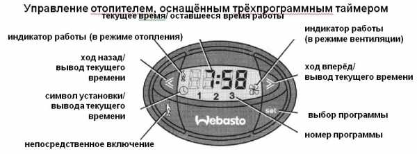 На следующей схеме показаны значения кнопок на распространенном пульте модели 1533. Как вы можете сами убедиться, несмотря на кажущуюся утилитарность, таймер Вебасто и собственно управление прибором представляет довольно сложный процесс.