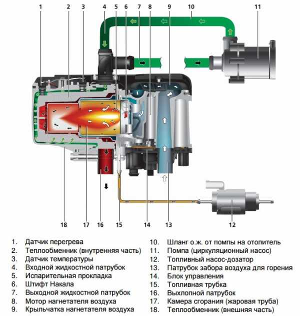 В небольшую камеру сгорания устройства поступает топливо (используется бензин из бака машины). При сгорании выделяется тепло, нагревающее жидкость в теплообменнике. Эта жидкость с помощью насоса по контуру охлаждения нагревает двигатель и печь салона.