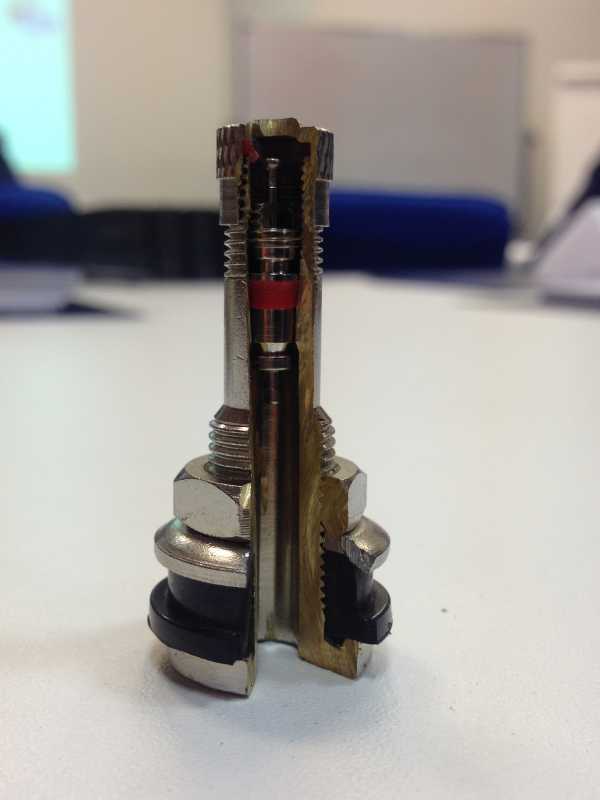 Вентиль состоит из тела вентиля, золотника и колпачка. Используемые в этих частях материалы — это резина, металл и немного пластика.