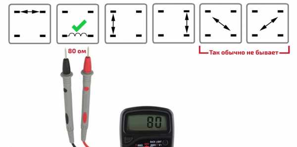 Предположим, что у нас реле с 4 выводами – то есть, с парой нормально разомкнутых контактов, работающих на замыкание (реле с переключающей контактной «тройкой», проверяется аналогичным образом). Сперва касаемся щупами тестера поочередно всех пар контактов. В нашем случае это 6 комбинаций (изображение условное, чисто для понимания).