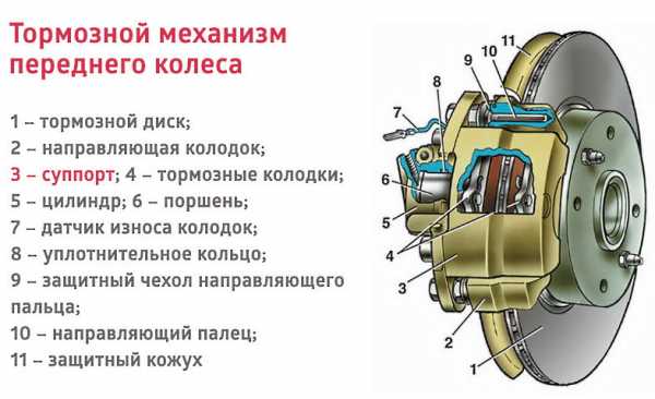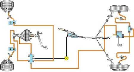 После нажатия водителя на тормозную педаль усилие передается на поршень главного тормозного цилиндра (ГТЦ). Он сжимает жидкость, которая по магистралям передает усилие на колесные цилиндры, установленные в каждом колесе. Они воздействуют на тормозные колодки, которые прижимаются к дискам или барабанам. При максимальном усилии вращение колес блокируется полностью. Тормозная система может быть дисковой, барабанной или комбинированной. Комбинированная тормозная система спереди оснащена дисками, обеспечивающими большую эффективность торможения, а сзади стоят барабаны.