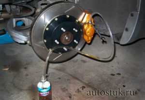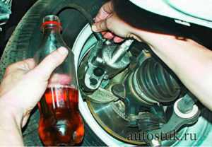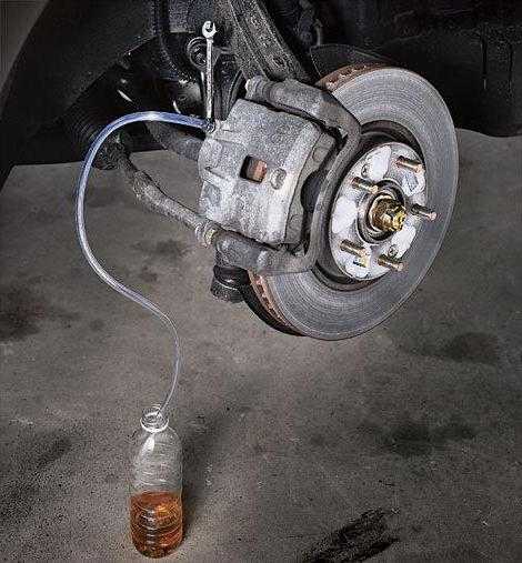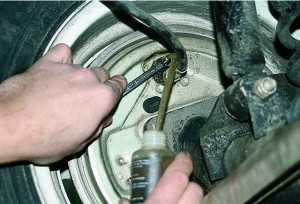 Примечание. До начала операции на каждый клапан нужно надеть отводящий шланг, опустив другой его конец в подходящую емкость – вытекающая тормозная жидкость может повредить шины и лакокрасочные покрытия на деталях подвески, тормозов, колес.