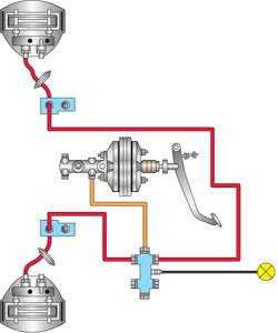 Применение тормозного контура позволяет предупредить полный отказ тормозов. Если протечет один из рабочих цилиндров, а это довольно распространенное явление в гидравлической системе, остальные колеса будут тормозить. Существует несколько вариантов, позволяющих реализовать многоконтурную систему. При осевой системе контуры разделяются по осям колес. Диагональный контур разделяет передние и задние колеса по диагонали. Встречаются и другие комбинации разделения контуров.