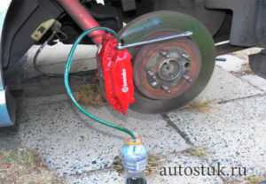 Доливаем жидкость в бачок до нужного уровня. Поддомкрачиваем автомобиль, снимаем колесо. Одеваем на штуцер трубку, другой конец опускаем в емкость с небольшим количеством ТЖ. Помощник делает несколько качков педалью и удерживает ее. Немного откручиваем штуцер, чтобы пошла жидкость. Сначала в ней будет много воздушных пузырьков, которые хорошо видны в прозрачной трубке. Закручиваем штуцер и повторяем процедуру. Делаем так до тех пор, пока не потечет чистая жидкость без пузырьков.