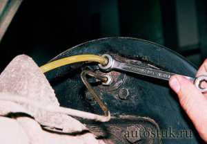 После остановки проводим проверку. Если в бачке нет ТЖ, производилась замена деталей с разгерметизацией или видны места утечки, после долива и ремонта требуется прокачать тормоза и устранить попавший воздух. Понадобится прозрачная трубочка с диаметром, который позволит надеть ее на штуцер, и емкость для старой жидкости. Чтобы открутить штуцеры, применяется ключ на 8 или 10. Вместо обычного рожкового лучше пользоваться специальным, с большим количеством граней, потому что открутить штуцер иногда очень сложно.