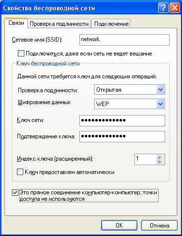 Удостоверьтесь, что галочка на кнопке-флажке Это прямое соединение компьютер-компьютер точки доступа не используется не стоит.