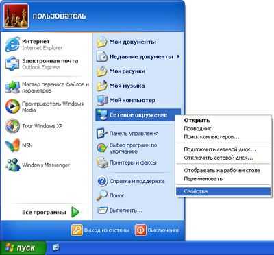 Для меню Пуск по умолчанию: нажмите Пуск и правой кнопкой мыши нажмите на Сетевое окружение. затем в ниспадающем меню выберите Свойства.