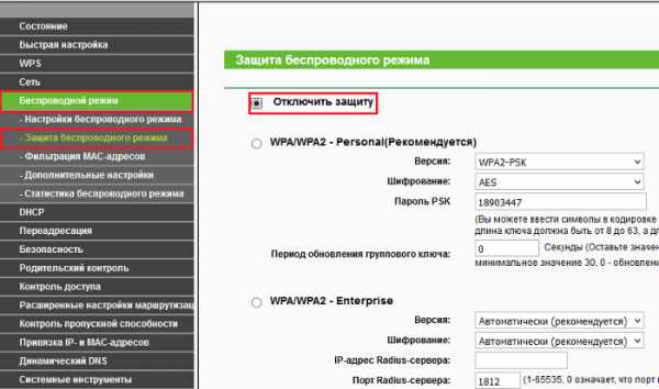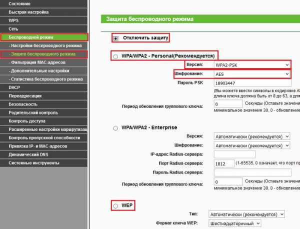 Откроется интерфейс роутера. Заходим на вкладку Беспроводной режим, подпункт Защита беспроводного режима.