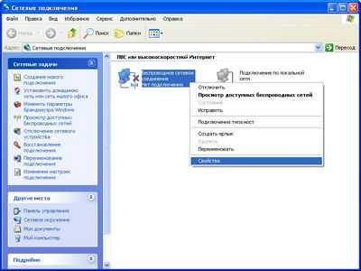 В окне Сетевые подключения нажмите правую кнопку мыши на значке Беспроводное сетевое соединение и в ниспадающем меню выберите Свойства.